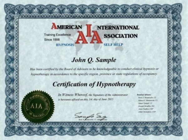 Graduates receive a complimentary one-year certification membership with the American International Association of Hypnosis (AIA).